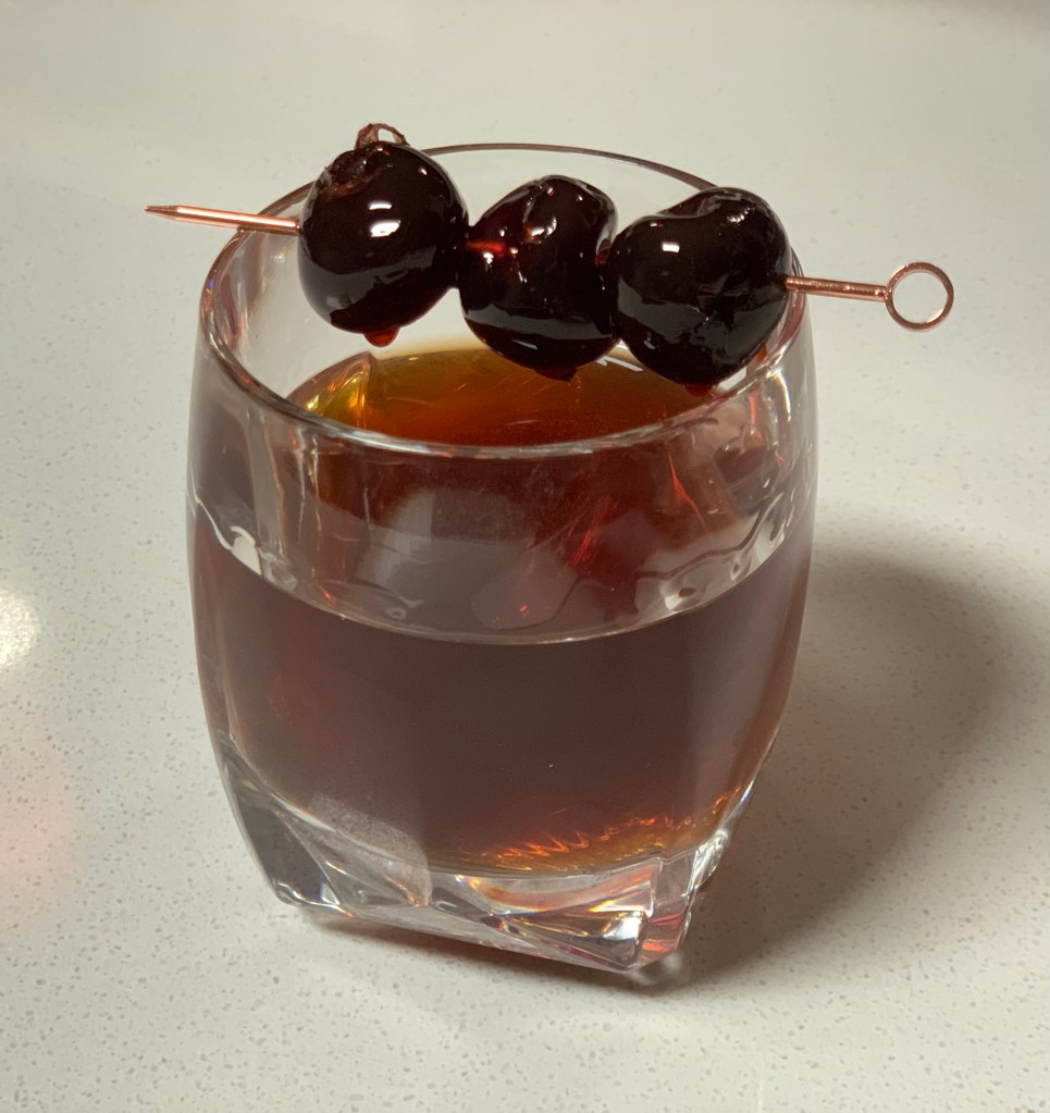Stir. Rinse rocks glass with Pimento Dram. Strain over large ice cube. Garnish brandied cherries.